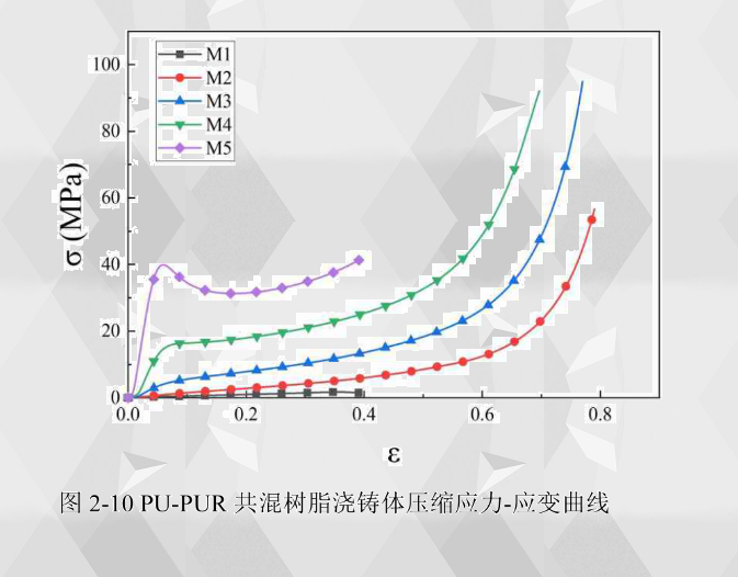 PU-PUR共混樹脂澆鑄體的壓縮應力-應變曲線如圖2-10所示,可以看出,M4和M5聚脲樹脂澆鑄體在應力-應變曲線上出現(xiàn)了明顯的線彈性階段和屈服階段。在應變達到0.39的時候M1聚氨酯和M5聚脲樹脂澆鑄體都已經(jīng)處于變形失效的狀態(tài),聚氨酯澆鑄體發(fā)生扭曲變形失效,聚脲澆鑄體發(fā)生脆性斷裂失效。而共混樹脂澆鑄體M2、M3和M4在應變達到0.5以上時才開始逐漸失效且擁有更長的平臺段,失效應變分別為0.64、0.59和0.51。說明在應變率較大的情況下,M2、M3和M4樹脂澆鑄體的壓縮力學性能 要強于單獨的M1聚氨酯和M5聚脲,可以承擔更大的壓縮位移而不失效。