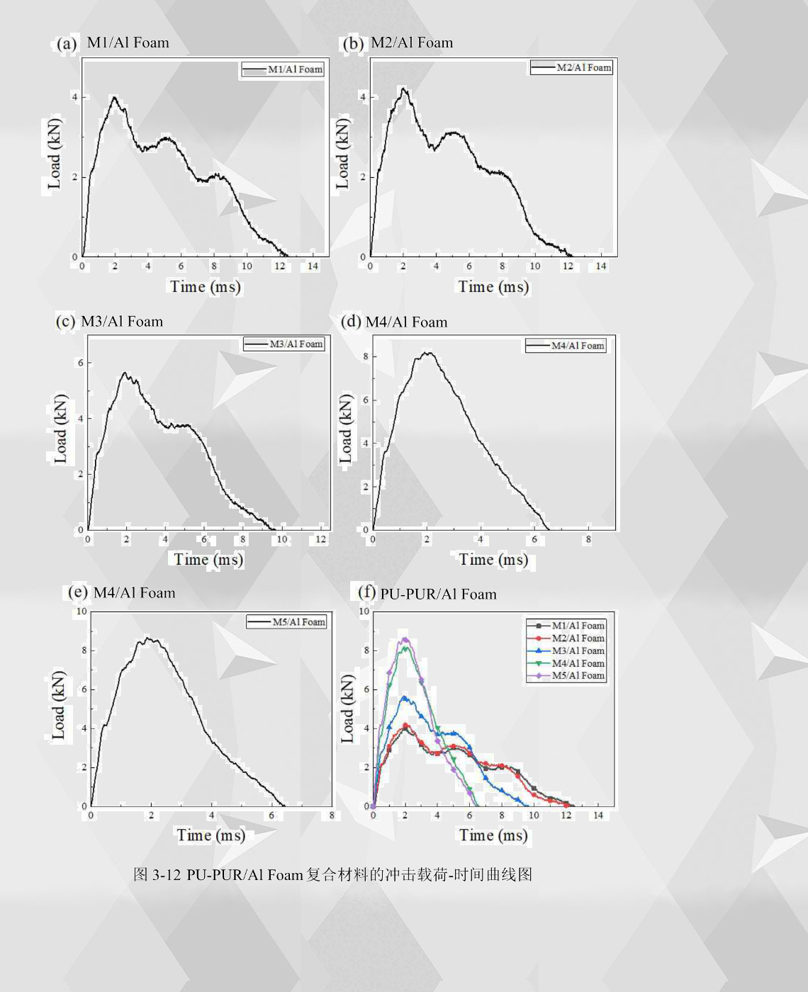 綜合從載荷-時間曲線來看,M4/Al FoamM5/Al Foam的到達峰值載荷時間更快,峰值載荷都很高,沖擊持續時間較短,說明這兩種復合材料在受到沖擊荷載時可以更快速地響應而具有更高的抗沖擊能力。