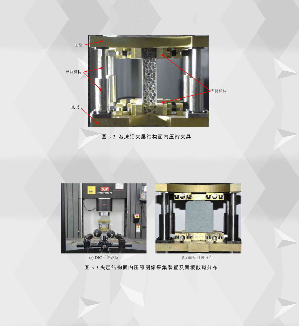本章泡沫鋁夾層結構面內壓縮試驗所用到的實驗加載機器為INSTRON5894萬能試驗機,以恒定壓縮加載速率1mm/min作用在壓盤上。考慮到過大的加載位移可能超出夾層結構的承載能力,對其過大的變形研究意義不大,因此本章分析所有試件的極限加載位移的設定為5.5mm。為了獲得芯層泡沫鋁的破壞形式和面板的屈曲過程,對其側面(即圖3.2所示試件位置)進行圖像采集;與此同時,采用數(shù)字圖像相關技術(DIC)測量夾層結構面板的變形量,如圖3.3所示(a),根據(jù)DIC技術采集原理,在開始面內壓縮試驗之前需要對夾層結構面板表面噴涂啞光白漆作為底漆,等待底漆晾干之后再噴啞光黑漆,形成可以被DIC采集設備識別的散斑,面板處理之后散斑分布效果如圖3.3(b)所示。