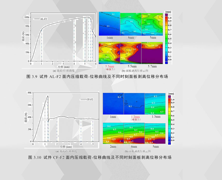 對面板材料為彈塑性材料的鋁合金夾層結(jié)構(gòu)AL-F2而言,在發(fā)生面板局部屈曲之前,剝離位移場的分布規(guī)律較為隨機(jī);當(dāng)曲線達(dá)到峰值載荷時(shí),面板邊緣出現(xiàn)多處局部屈曲,隨后面板與芯層之間的分離面積以及分離程度隨加載位移的增加而變得越來越大,面板的屈曲程度也越來越大,面板的承載能力顯著降低,導(dǎo)致試件整體承載能力急劇下降。對面板材料為脆性材料的碳纖維增強(qiáng)夾層結(jié)構(gòu)CF-F2而言,在峰值載荷之前,發(fā)生面板斷裂的一側(cè)邊緣先出現(xiàn)剝離位移,而另外一側(cè)剝離位移非常小,與鋁合金夾層結(jié)構(gòu)相比,纖維增強(qiáng)夾層結(jié)構(gòu)的剝離位移要小很多;峰值載荷之后,面板剝離位移分布場呈現(xiàn)較為規(guī)律的帶狀分布,分布規(guī)律為以斷裂處為中心,向上下兩邊緣呈帶狀擴(kuò)散;從剝離位移分布場可以看出纖維增強(qiáng)夾層結(jié)構(gòu)的面板斷裂方式為某一側(cè)先發(fā)生斷裂破壞。