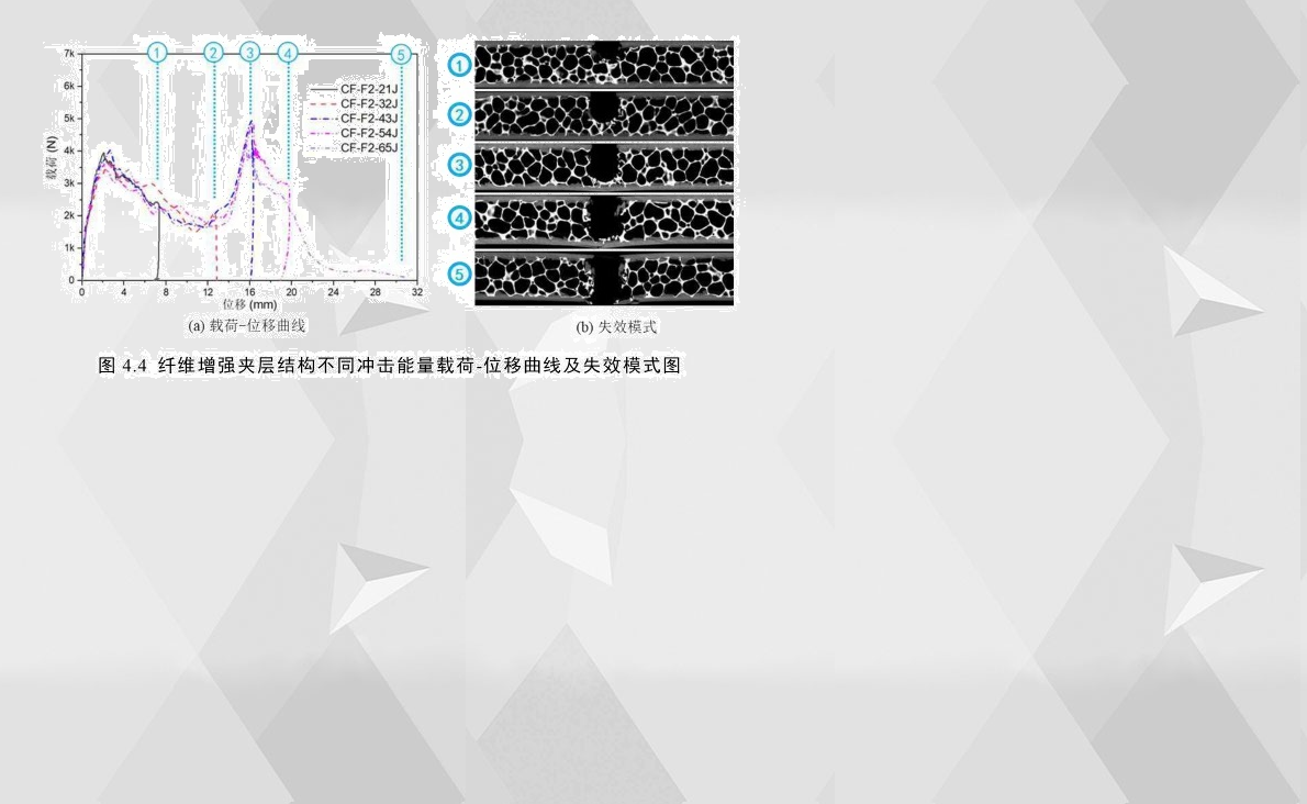 通過(guò)分析發(fā)現(xiàn),碳纖維夾層結(jié)構(gòu)和玻璃纖維夾層結(jié)構(gòu)的具備相似的沖擊失效機(jī)理,以CF-F2為例,通過(guò)其在不同沖擊速度下得到的載荷-位移曲線(xiàn)對(duì)比來(lái)看,如圖4.4(a)所示,當(dāng)前速度范圍的應(yīng)變率對(duì)此纖維增強(qiáng)夾層結(jié)構(gòu)的機(jī)械響應(yīng)影響不大,所以亦可以用不同沖擊速度下的試件最終破壞形式來(lái)分析其損傷失效機(jī)理,這與鋁合金夾層結(jié)構(gòu)的分析方法類(lèi)似。通過(guò)觀察發(fā)現(xiàn),CF-F2的載荷-位移曲線(xiàn)和失效過(guò)程與AL-F2有很大地相似性,均存在兩個(gè)峰值載荷并且未出現(xiàn)面板與膠層失效分離。與AL-F2不同的是,由于CF-F2面板為脆性材料,其載荷達(dá)到第一次峰值載荷的位移要比AL-F2的小許多,并且CF-F2在第一階段的曲線(xiàn)更加接近線(xiàn)性增長(zhǎng);此外,前者在兩峰值載荷下降位置處,面板發(fā)生塑性斷裂,而后者發(fā)生脆性斷裂;由于兩者的第二階段皆以上下面板斷裂為界,所以此階段主要以泡沫芯層壓潰與芯層剪切吸能沖擊能量,通過(guò)對(duì)比兩者的第二階段,發(fā)現(xiàn)此階段兩者的位移長(zhǎng)度基本一致。需要特別注意的是,由于CF-F2的下面板的破壞區(qū)域位置比上面板的更大,如圖4.4(b)所示,其第二峰值載荷甚至比第一峰值載荷更高。