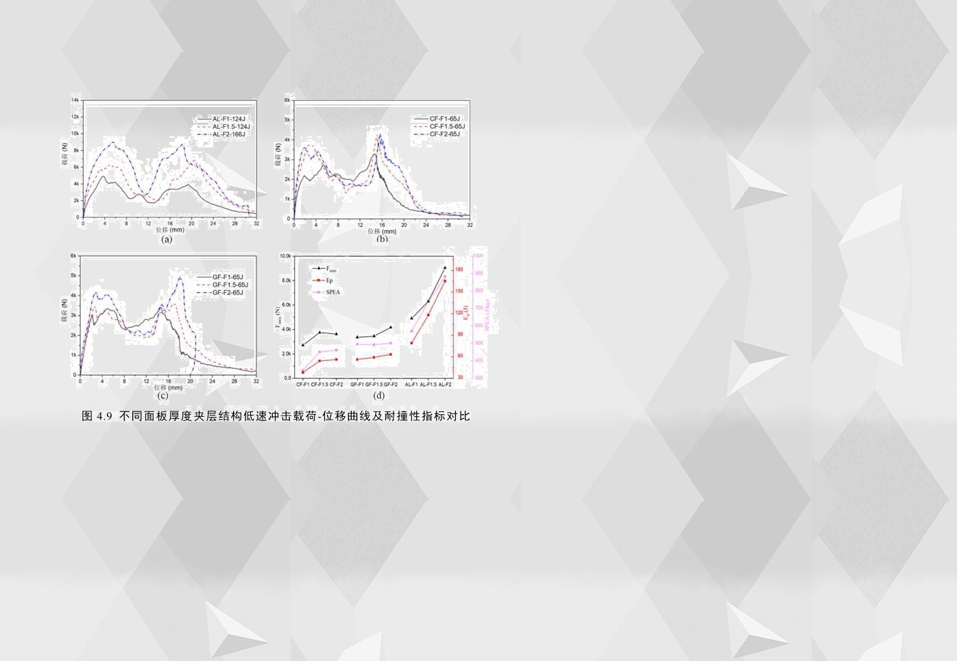 為了研究夾層結構的面板厚度對沖擊性能的影響,圖4.9(a)-(c)比較了三種不同面板厚度的夾層結構的載荷-位移曲線。無論是彈塑性面板還是脆性面板,夾層結構的面板厚度對其低速沖擊響應均有較大影響。為了更直觀地比較,圖4.9(d)對比了不同面板厚度夾層結構的耐撞性指標,通過觀察,鋁合金夾層結構的耐撞性能隨面板厚度增加而明顯增加,面板厚度從1mm增加到2mm,其初始峰值載荷、穿透吸能和比穿透吸能分別提高了84%108%54%;對玻璃纖維夾層結構而言,當面板厚度從1mm增加到2mm,其初始峰值載荷和穿透吸能分別只提高了24%13%,而面板厚度的增加對比穿透吸能的影響效果差異不大;而對碳纖維夾層結構而言,當面板厚度從1mm增加到2mm,其穿透吸能和比穿透能分別提高了42%33%,并且隨著層數的增加,耐撞性指標增加的幅度大幅減小。